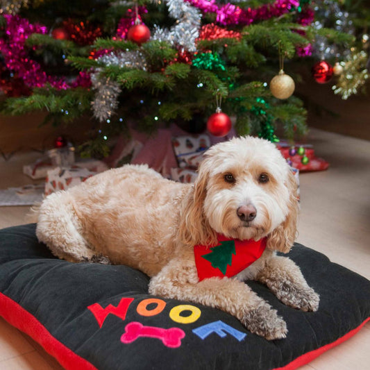 Dog Bed in Black Velvet with Rainbow Corner Woof
