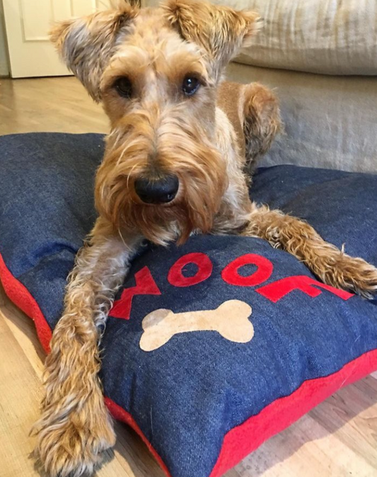 SPARE COVER for our dog beds in denim with red WOOF letters and a tan bone in the corner