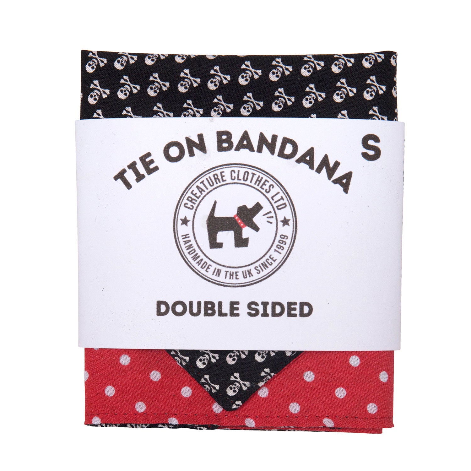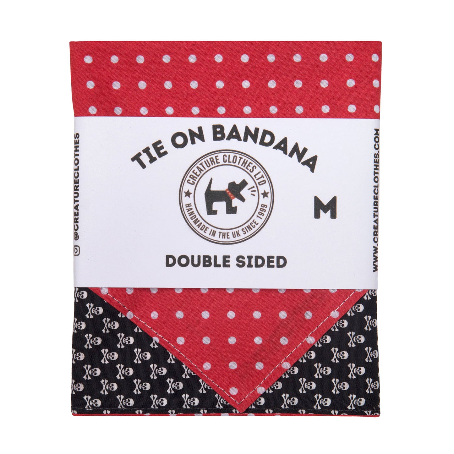 Our pirate and polka dot tie on dog bandana is adorable and cool all in one. It's perfect for dogs who wear harnesses, or who simply love a classic old school cowboy hankie kinda style. They are double sided so you can wear it any of 4 ways - showing just one print of a combo of the two. Check our Instagram for styling tips. Machine washable. Really fab.