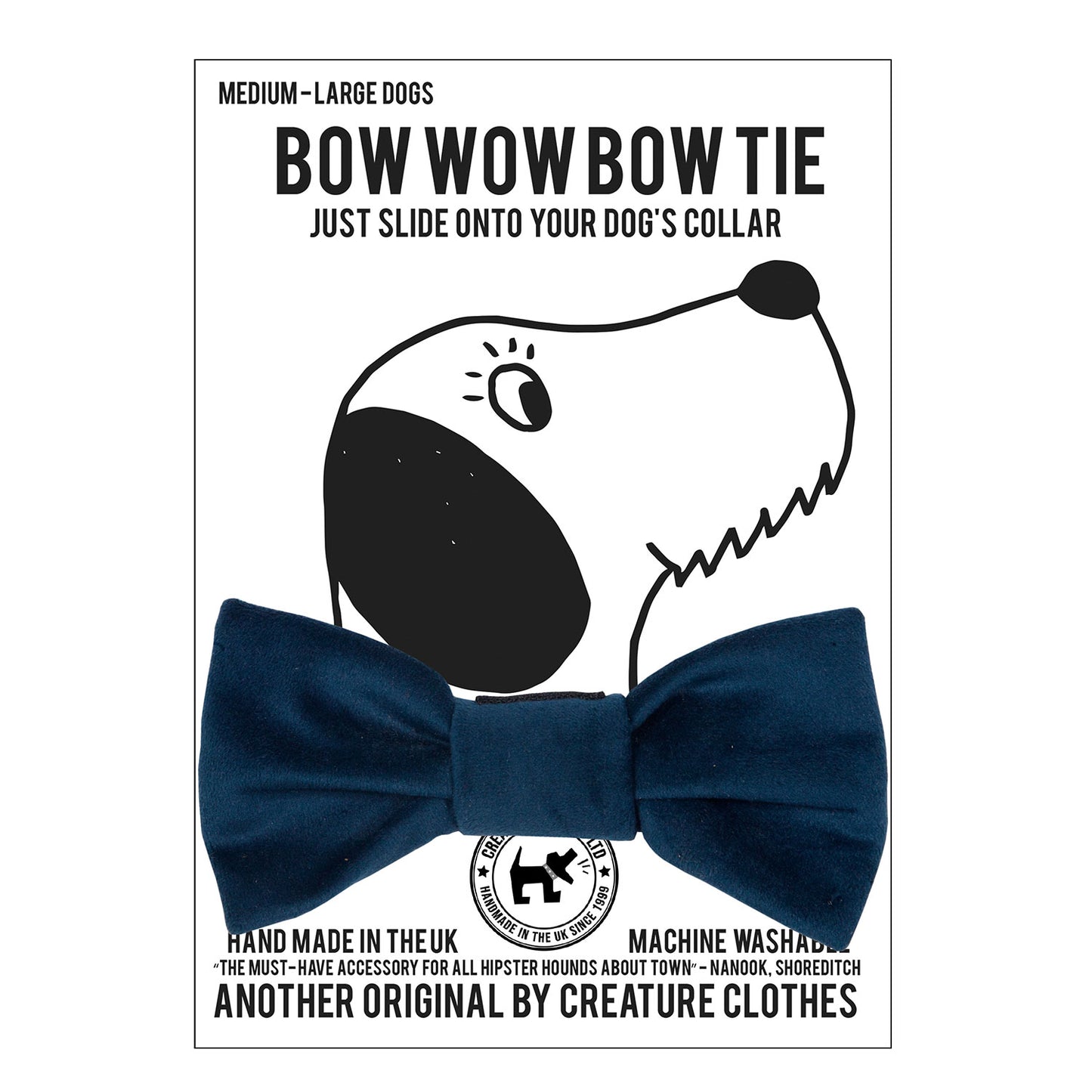 Our Dog Bow Tie in pacific blue velvet features an elasticated back loop so you simply slide it on to your dog's existing dog collar. Instant cool & perfect for dapper dogs everywhere. Hand made by us in our Suffolk workshop.
