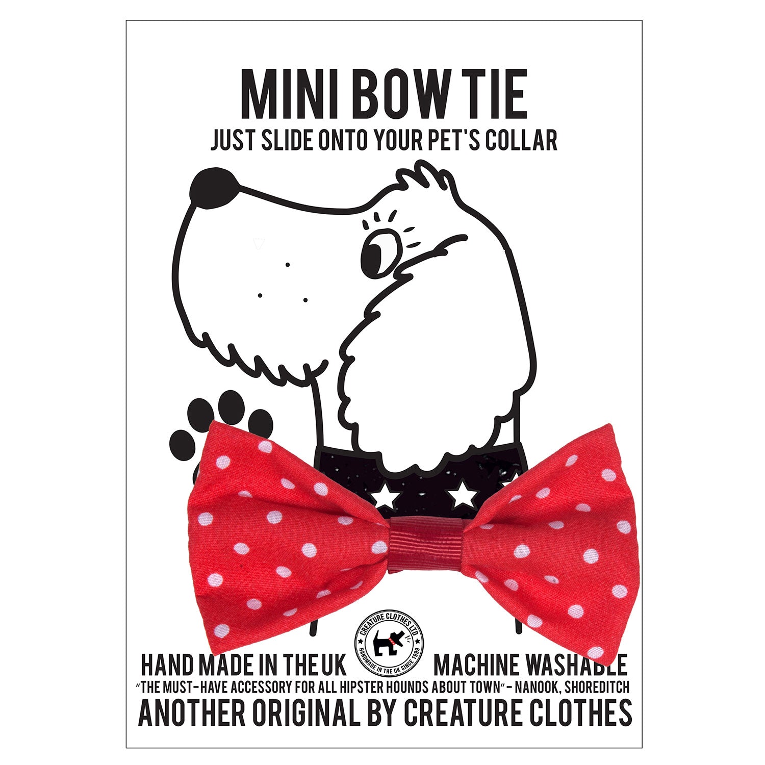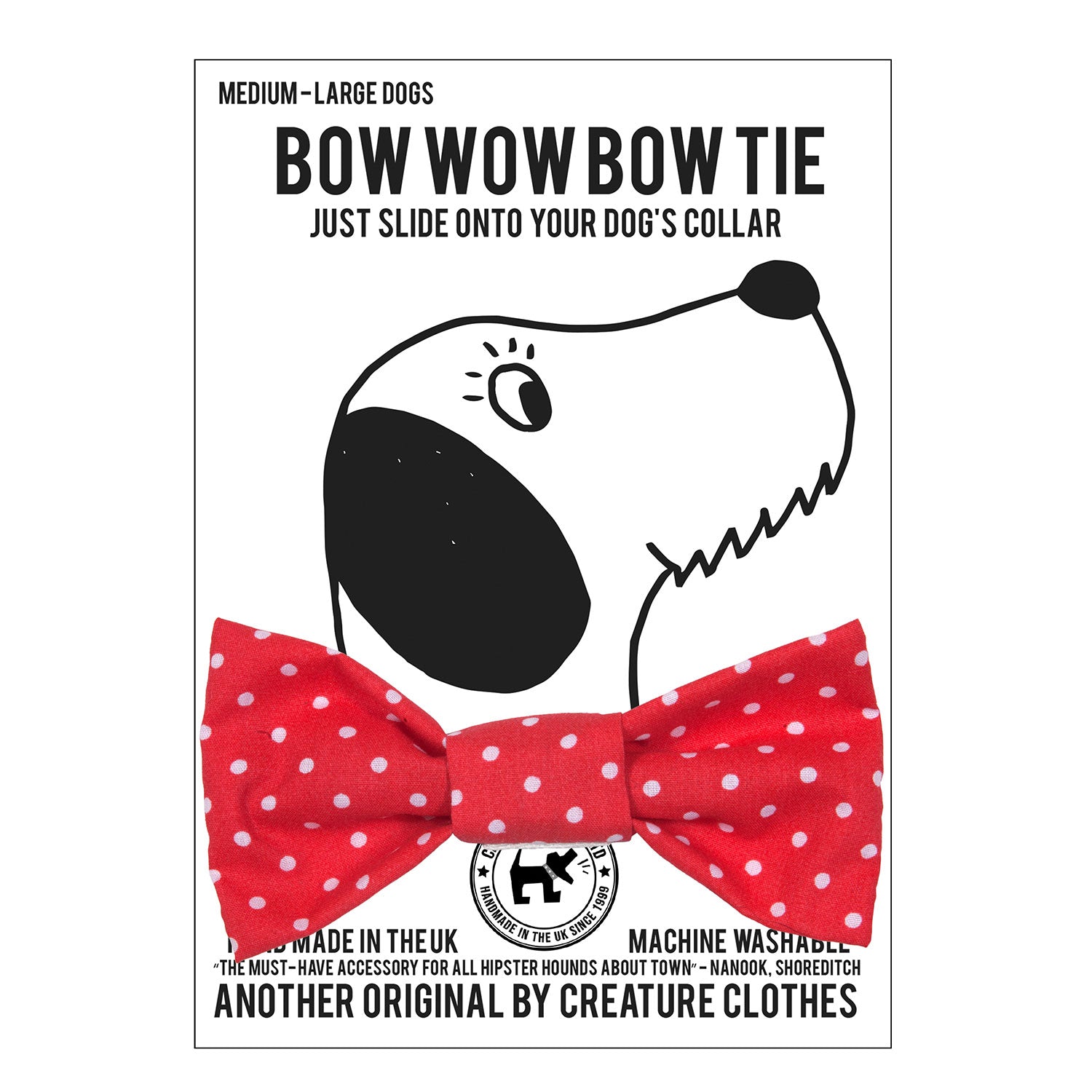 Our Dog Bow Tie in a red polka dot fabric features an elasticated back loop so you simply slide it on to your dog's existing dog collar. Instant cool & perfect for dapper dogs everywhere. Hand made by us in our Suffolk workshop.