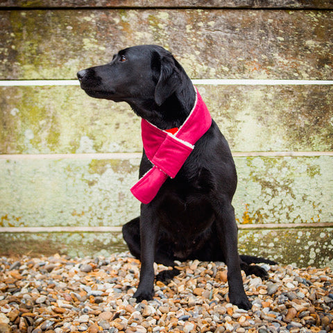 Our doggy scarves are made in either rich luxurious machine washable velvet or gorgeous machine washable tweeds. All of our doggy scarves have a sherpa fleece lining for a super snuggly fit against your dog's neck.