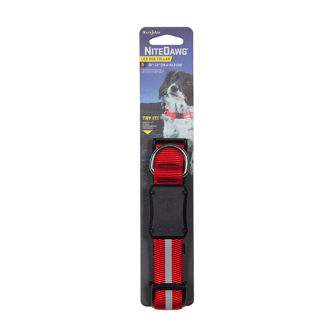 Fantastic light up dog collars for night time walks. Red and reflective silver adjustable webbing clip collar. The collar lights up within the webbing and has 2 modes - solid light or flashing. The light is battery operated, taking a round watch style battery, which is held secure in a screwed down compartment, so in our experience, if the collar gets a bit wet it will still keep working. 3 sizes available while stocks last.
