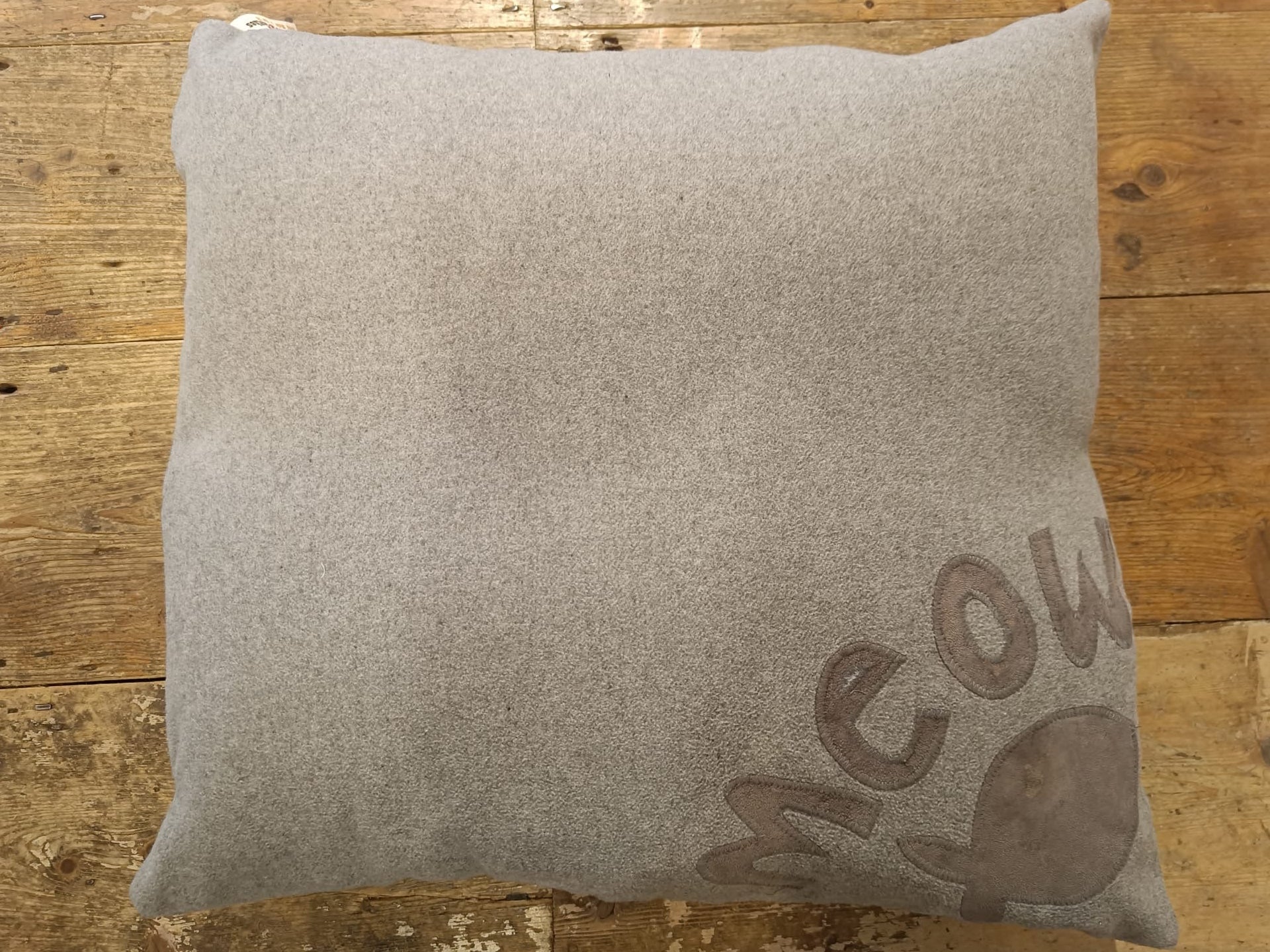 Our dog bed in grey fleece with a grey meow appliqué has a super soft polar fleece underside. It is fabulously comfy and machine washable inside and out.