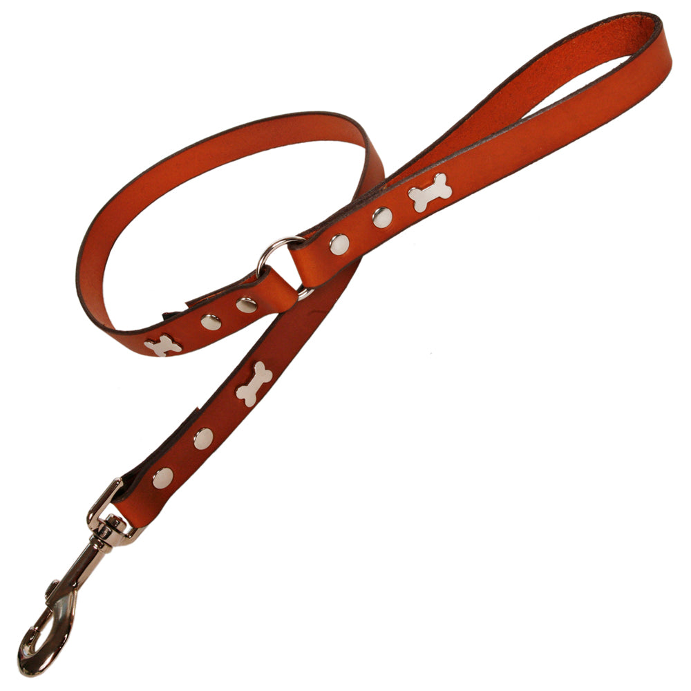 Classic tan leather dog lead with silver bone studs. Hand crafted in Suffolk, England. Length: 1m. Width 2cm.