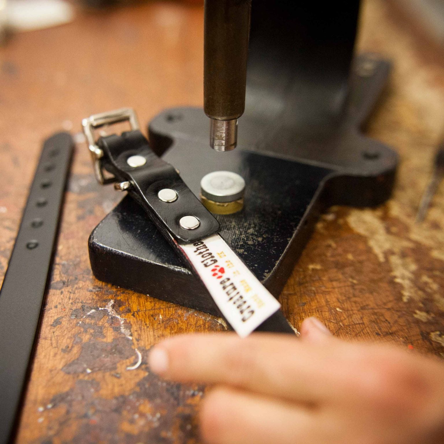 Studs: Our studs are exclusively hand made for us by Menorcan artisans. Each stud is individually punched out of sheets of solid brass. The rivet backs are then welded on, one by one, by hand. This creates the strongest bond possible. We use brass because it is best for the environment, very strong and the stud will not break or shear off like other, cheaper, composite metals. The silver colour studs are nickel plated solid brass. All of our studs are attached to the collars by us in our workshops in Suffolk or Brighton. The studs have brass backs for a hypoallergenic finish against the dogs neck. Due to the nature, mischief and fun loving curiosity of dogs (diving through hedges, rolling in muddy puddles…), occasionally we will be contacted to say a dog has lost a stud from their collar (in all of our 22 years of product testing this has never happened to one of our dogs collars despite much, MUCH mischief). If this does happen please contact us and we can replace the stud for you.
