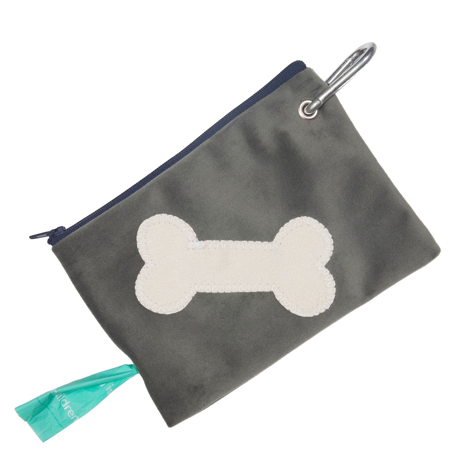The awesome little pouch to clip on to your dog's lead. It holds your dog treats, dispenses poo bags from the little eyelet at the side, holds a spare roll of poo bags and has enough space to hold a spare roll of poo bags, your house keys, even some sweeties for you! It's the extra pocket that you always need on your dog walks, that is always attached to your lead. Made in sage grey velvet with a cream applique bone.